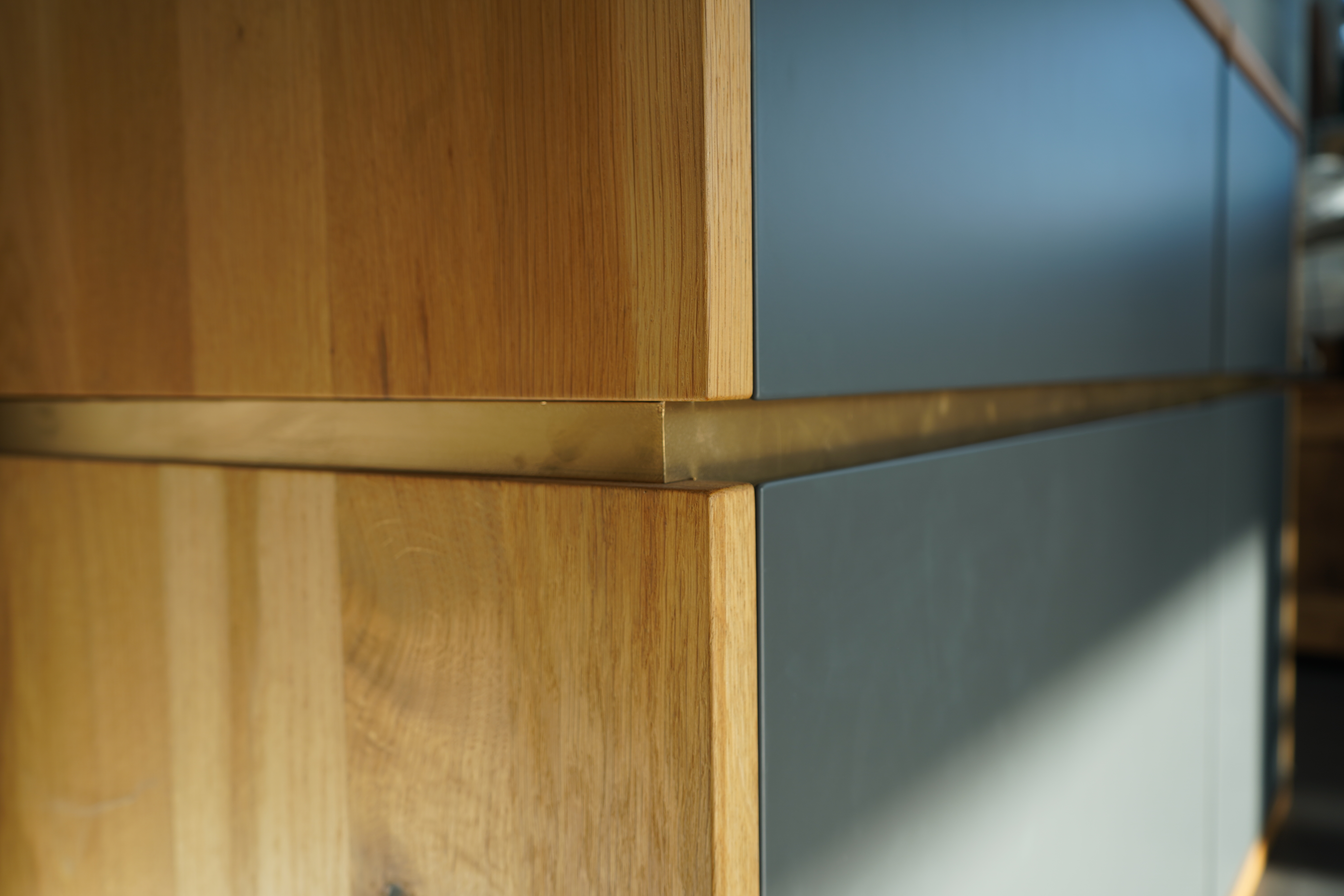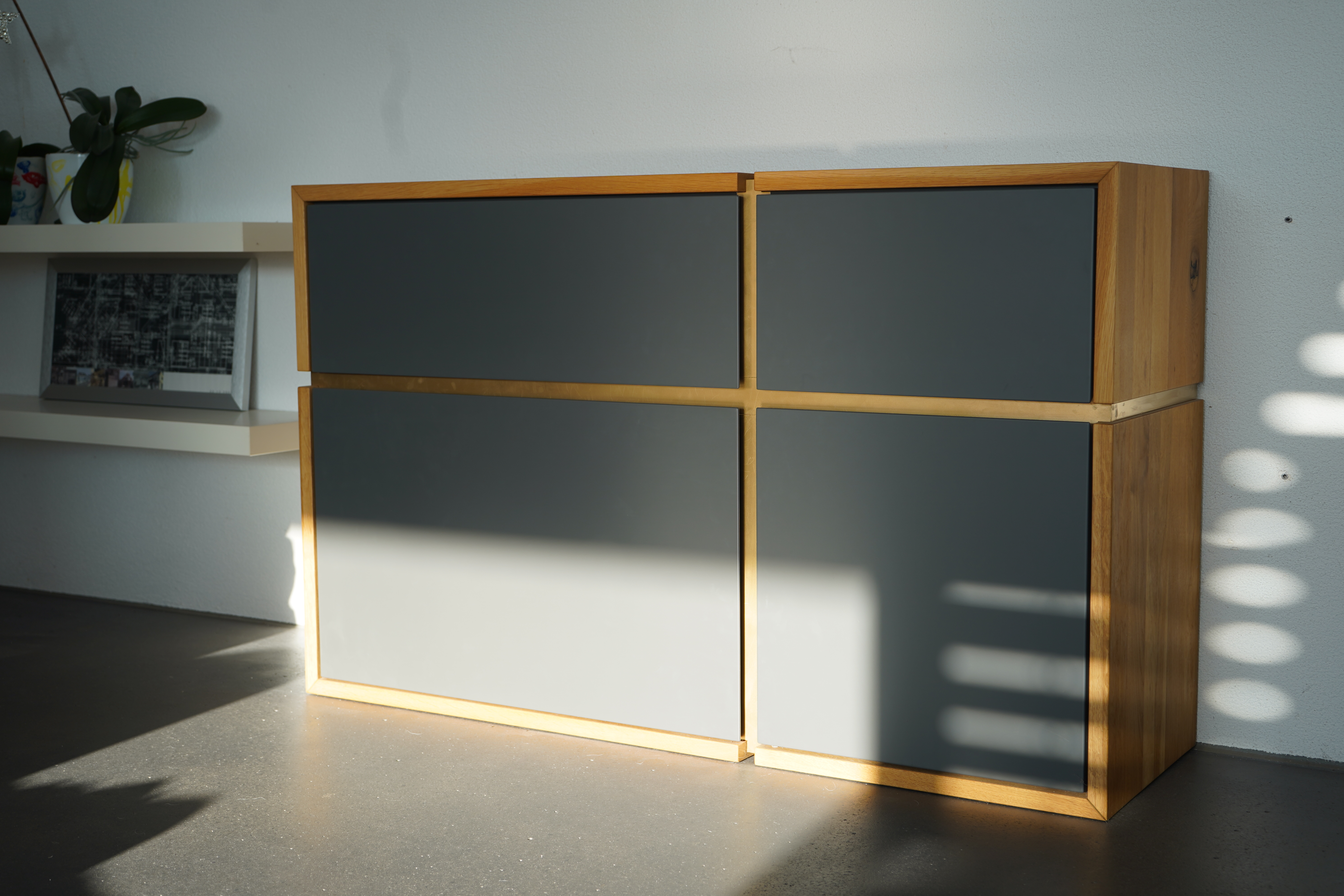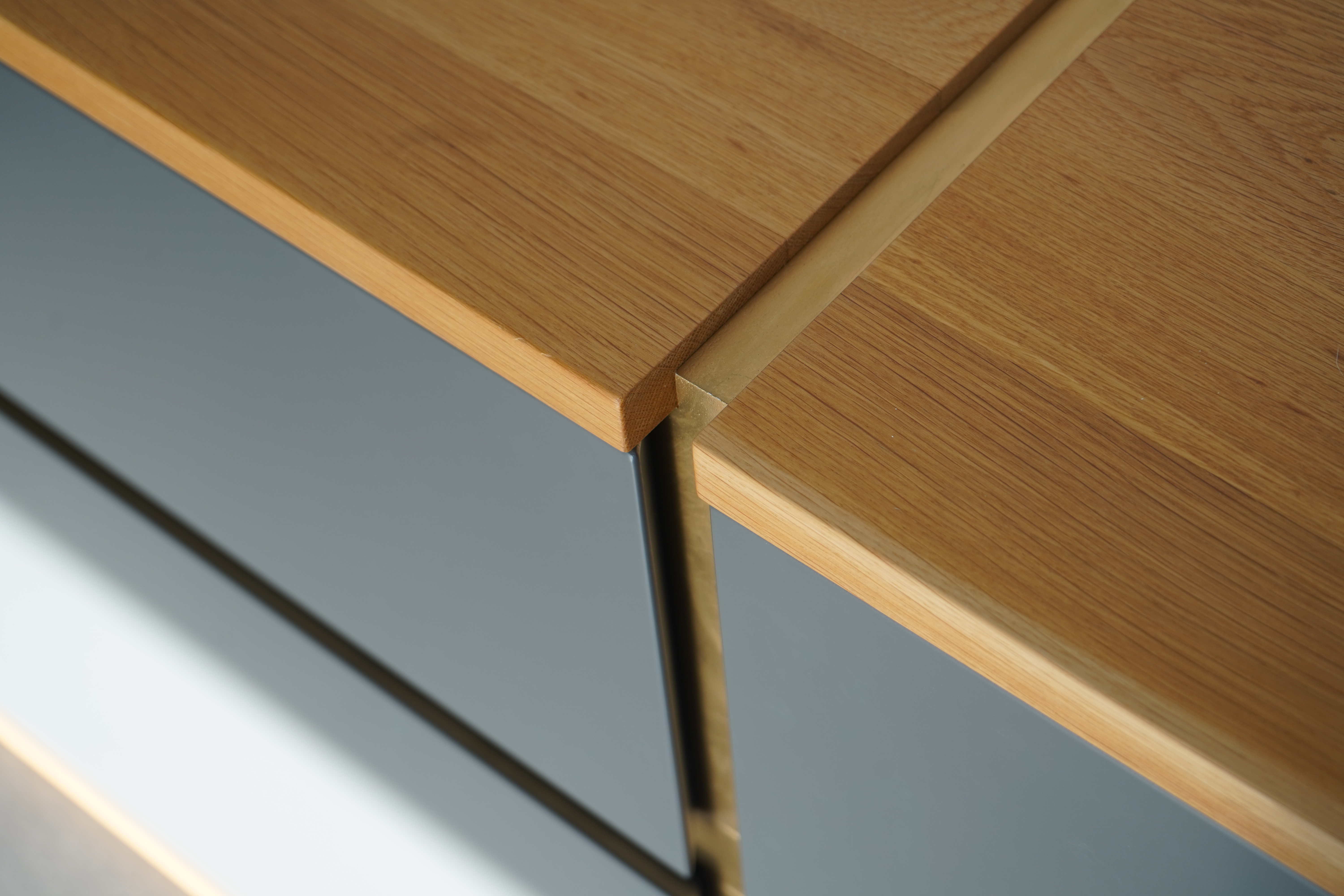 In 2022, I participated in the VSSM competition for apprentices, themed 'mobili d’oro' (golden furniture). My goal was to push the boundaries of the requirements by creating a sideboard where the 'Golden Ratio' served as the literal and conceptual foundation. Length, width, and depth were meticulously proportioned, with recesses in the visible surfaces accentuating the golden elements against anthracite-lacquered fronts.