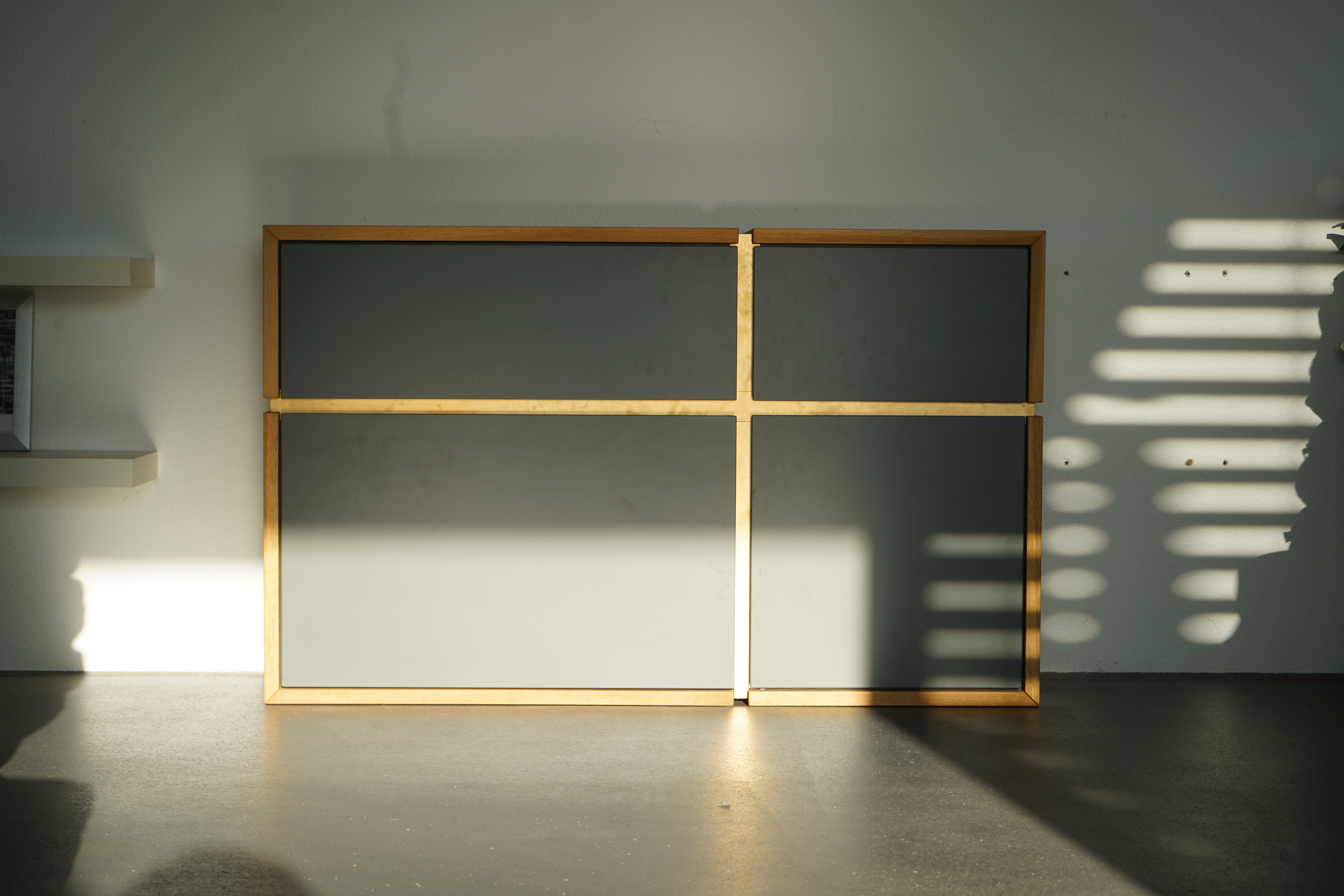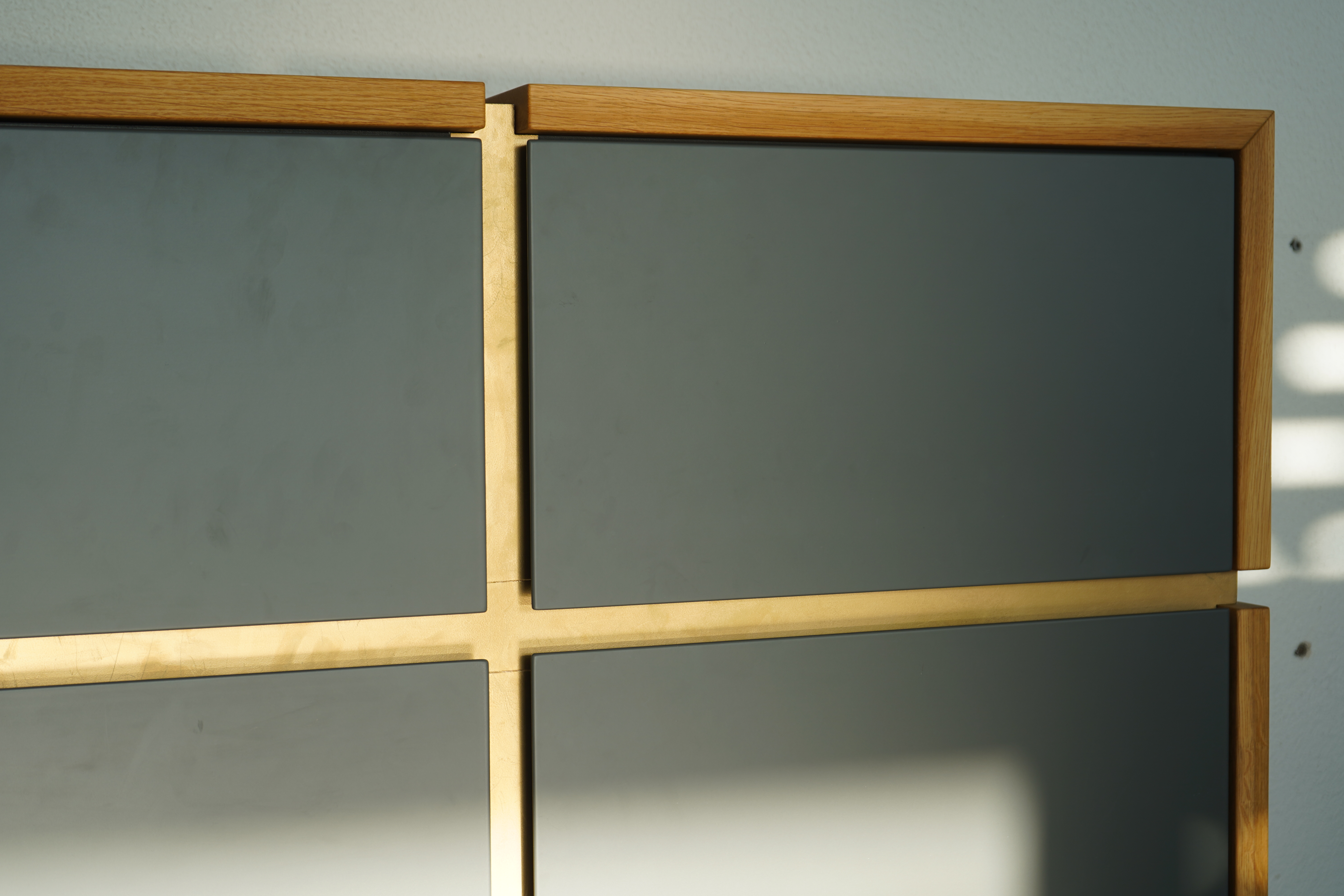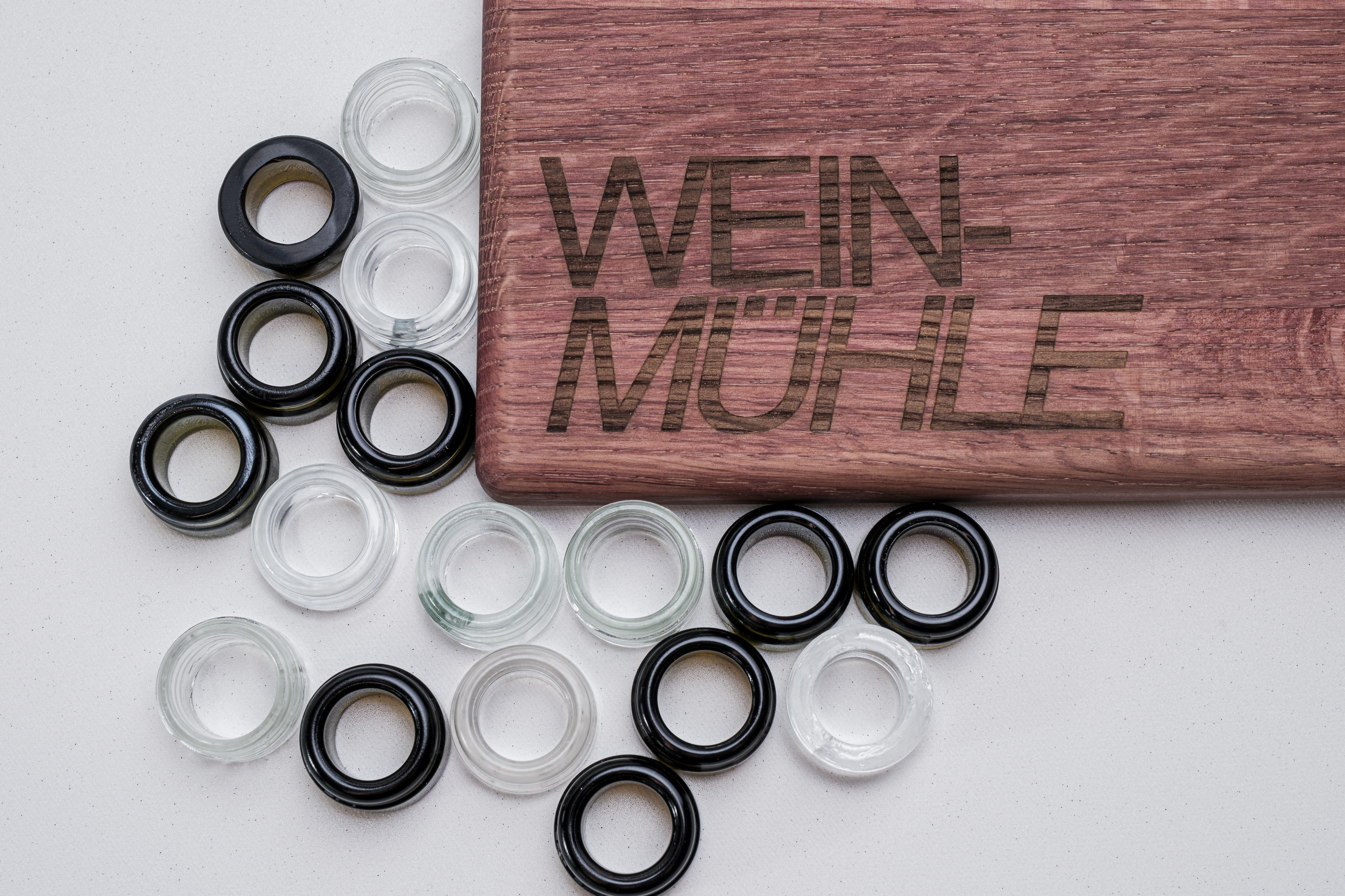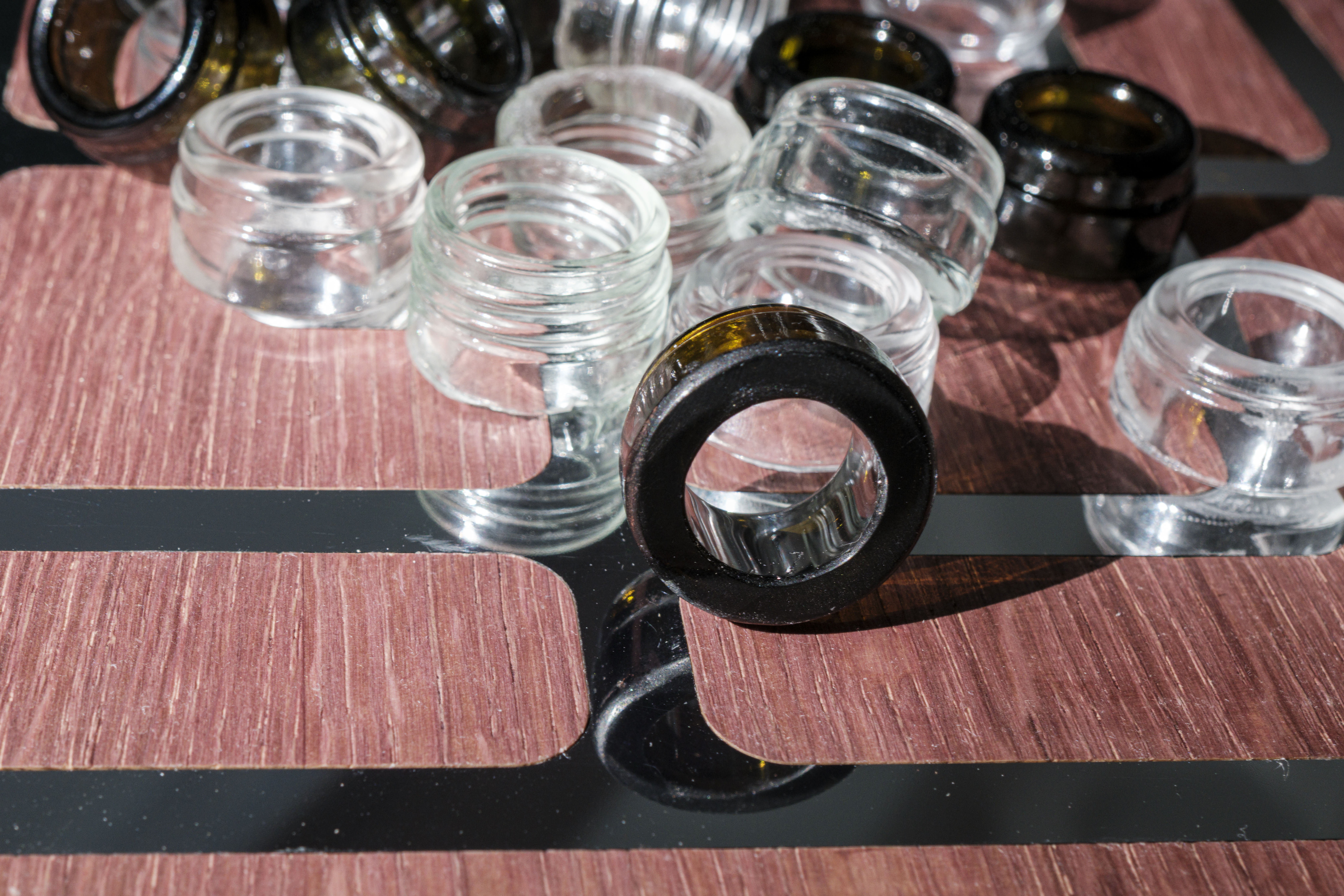 We combined a recycled acrylic mirror with oak offcuts from our workshop, creating a contrast between cold, metallic depth and the organic warmth of wood. Inspired by the tradition of aging wine in oak, we inverted the process by staining the wood in a red wine bath. To complement this, we repurposed the necks of wine bottles to create the eighteen glass playing pieces. I am particularly proud of the cohesive aesthetic—the precisely matched radii and the 'Wein-Mühle' branding unify the entire piece.