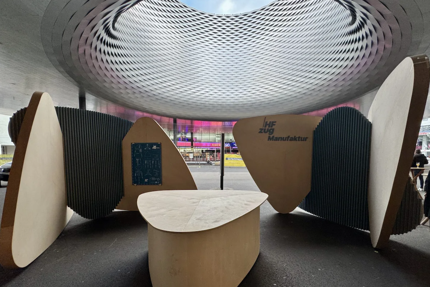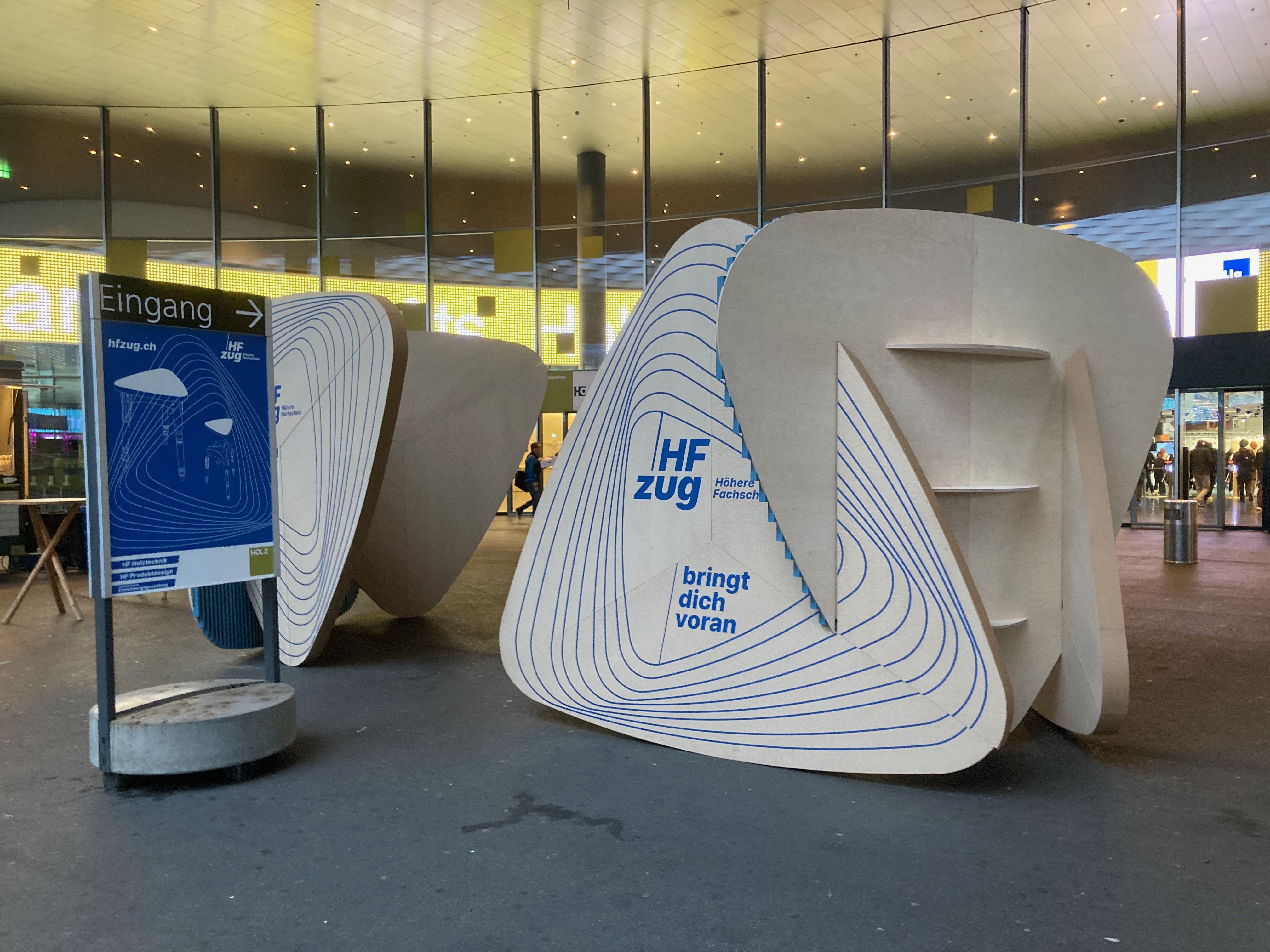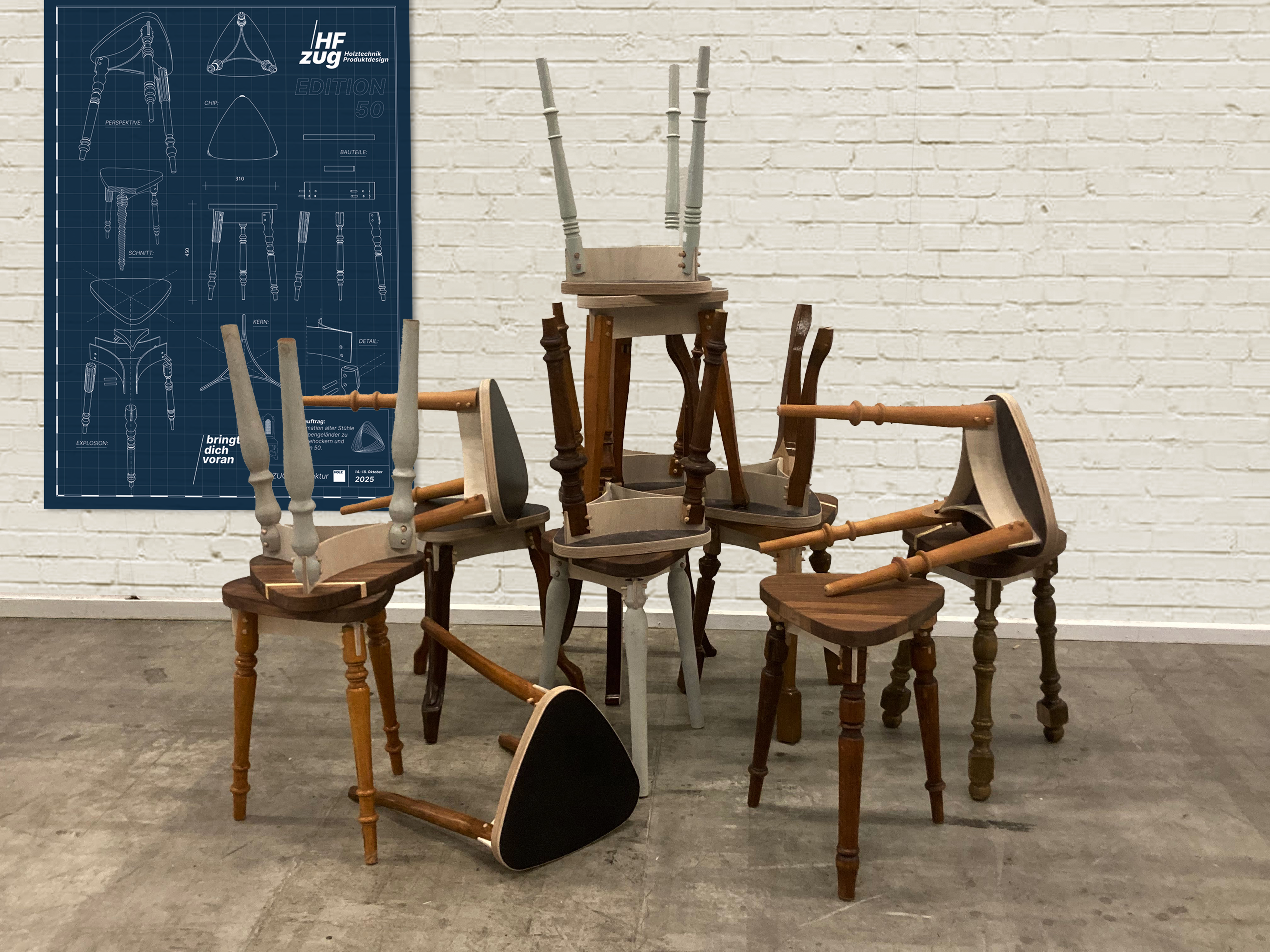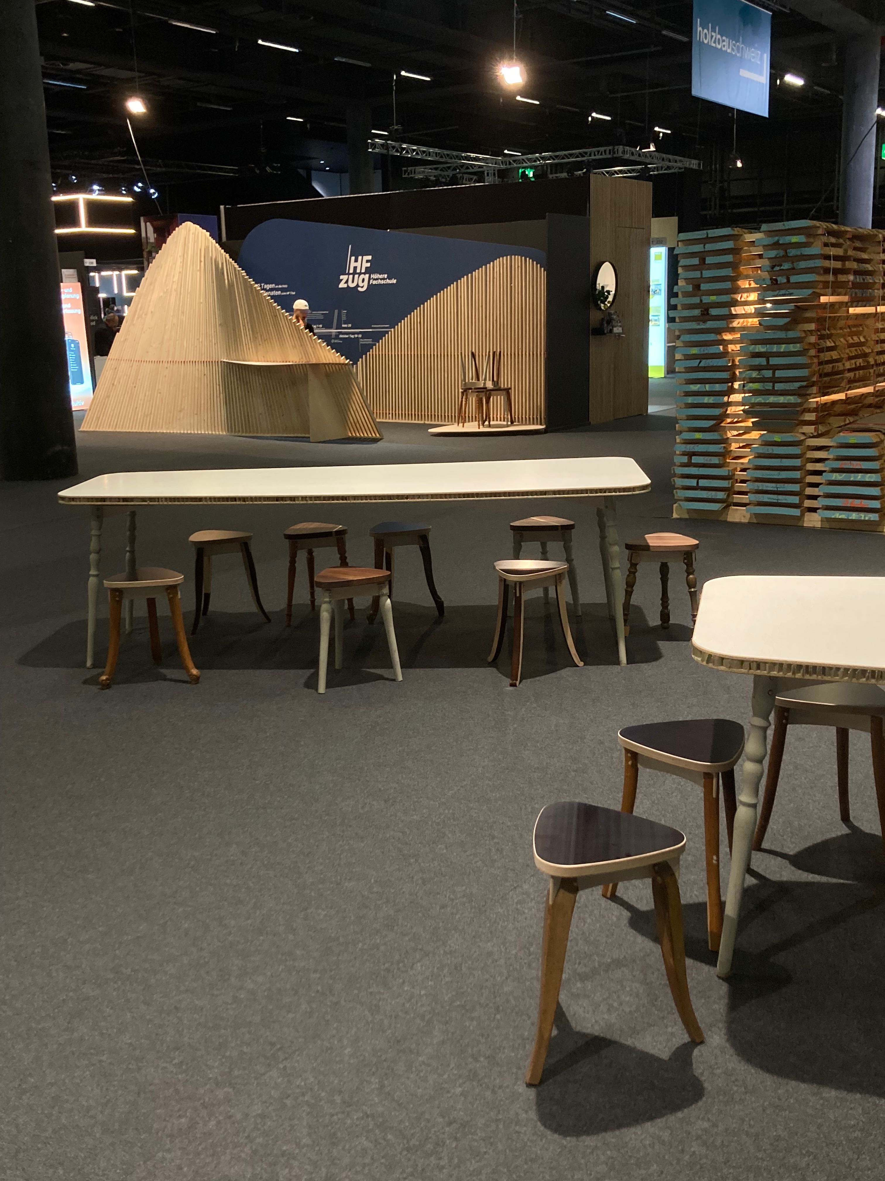 For the 'Holz 25' trade fair in Basel, we were challenged to create a comprehensive event platform under significant time pressure to showcase the rebranding of HF Zug. A key part of the project involved designing and producing 120 stools and 15 tables for a fair café using upcycling principles—transforming reclaimed solid wood chairs and railings into a modern, functional furniture series.